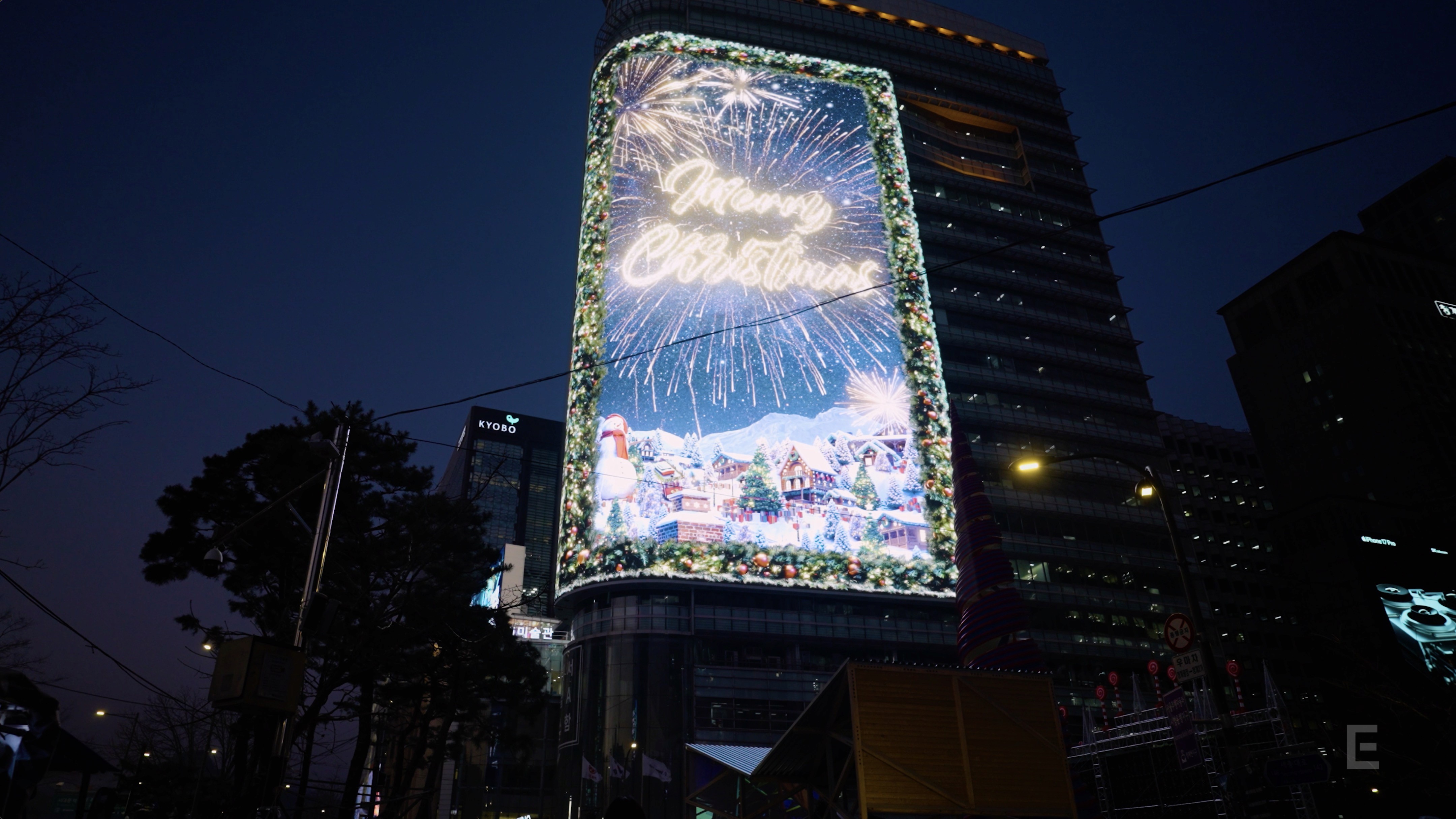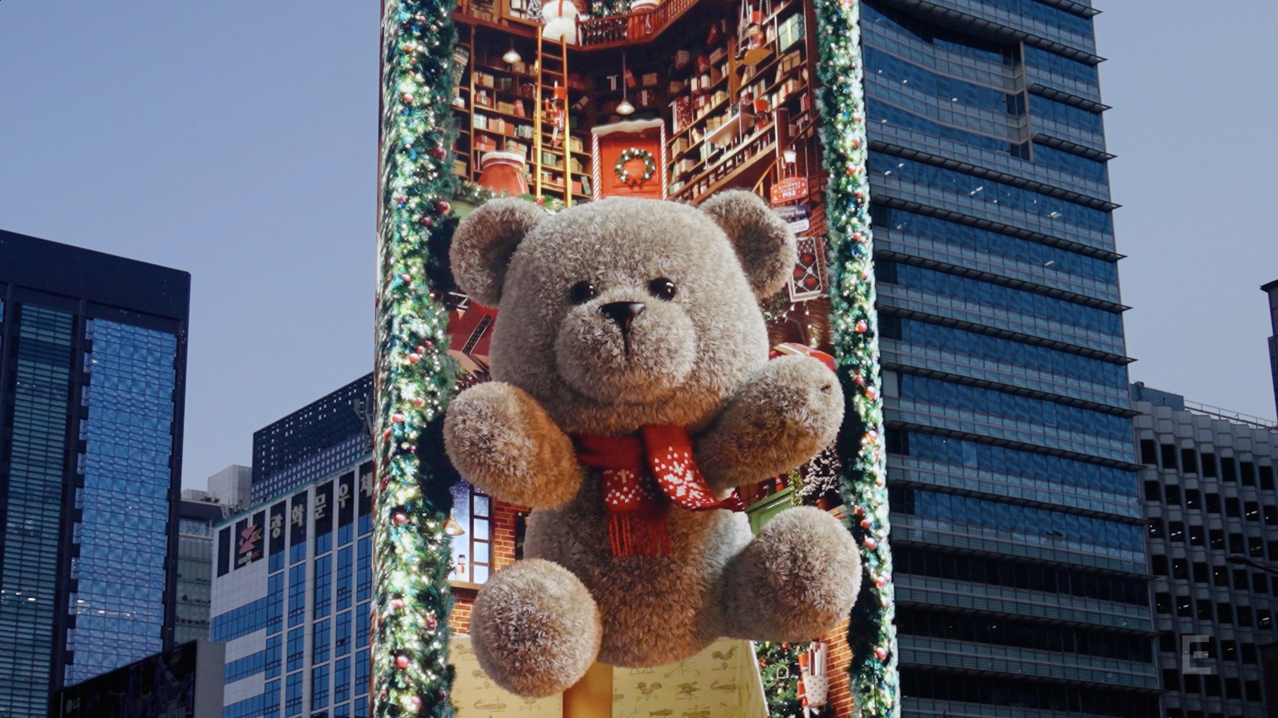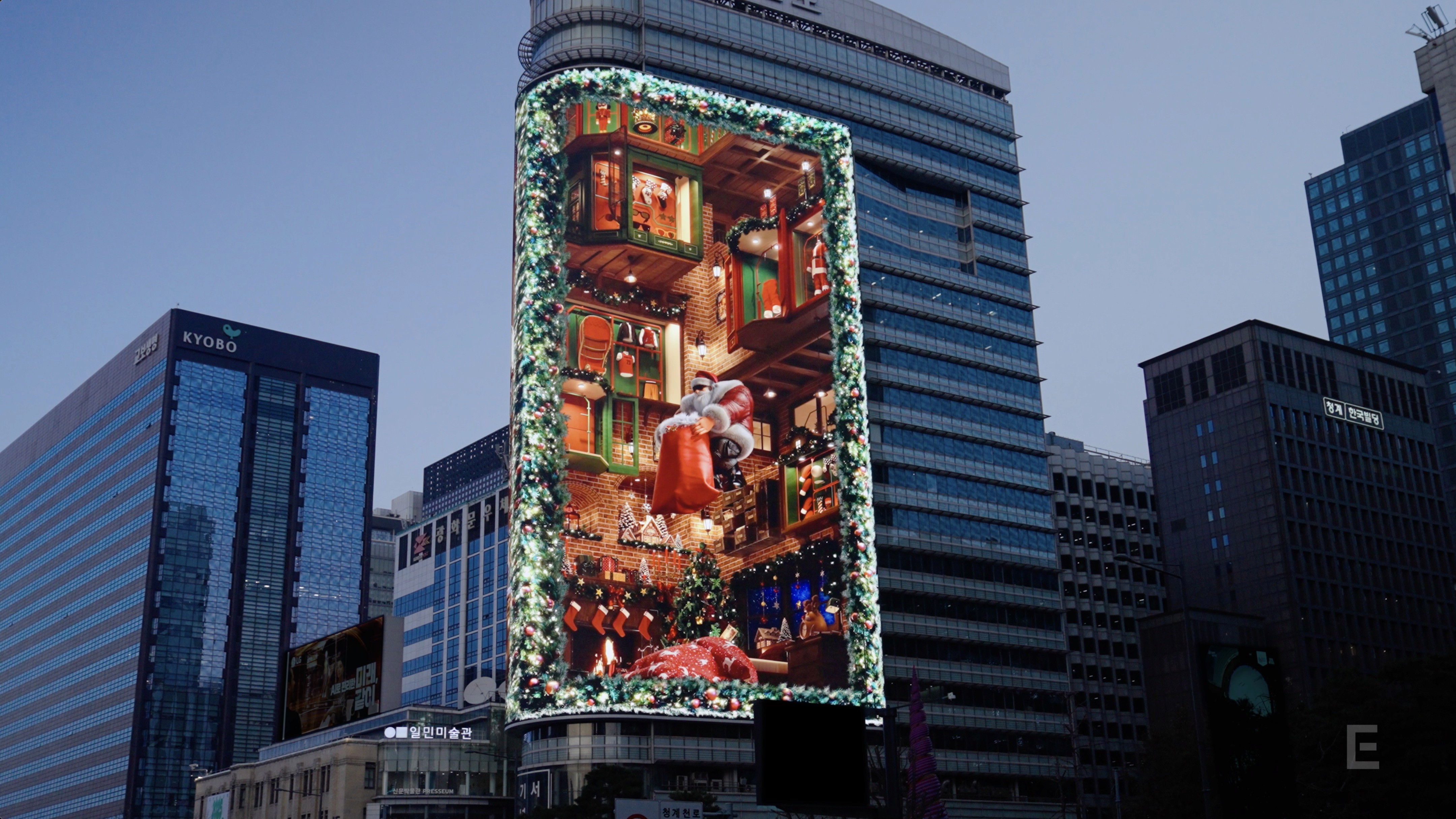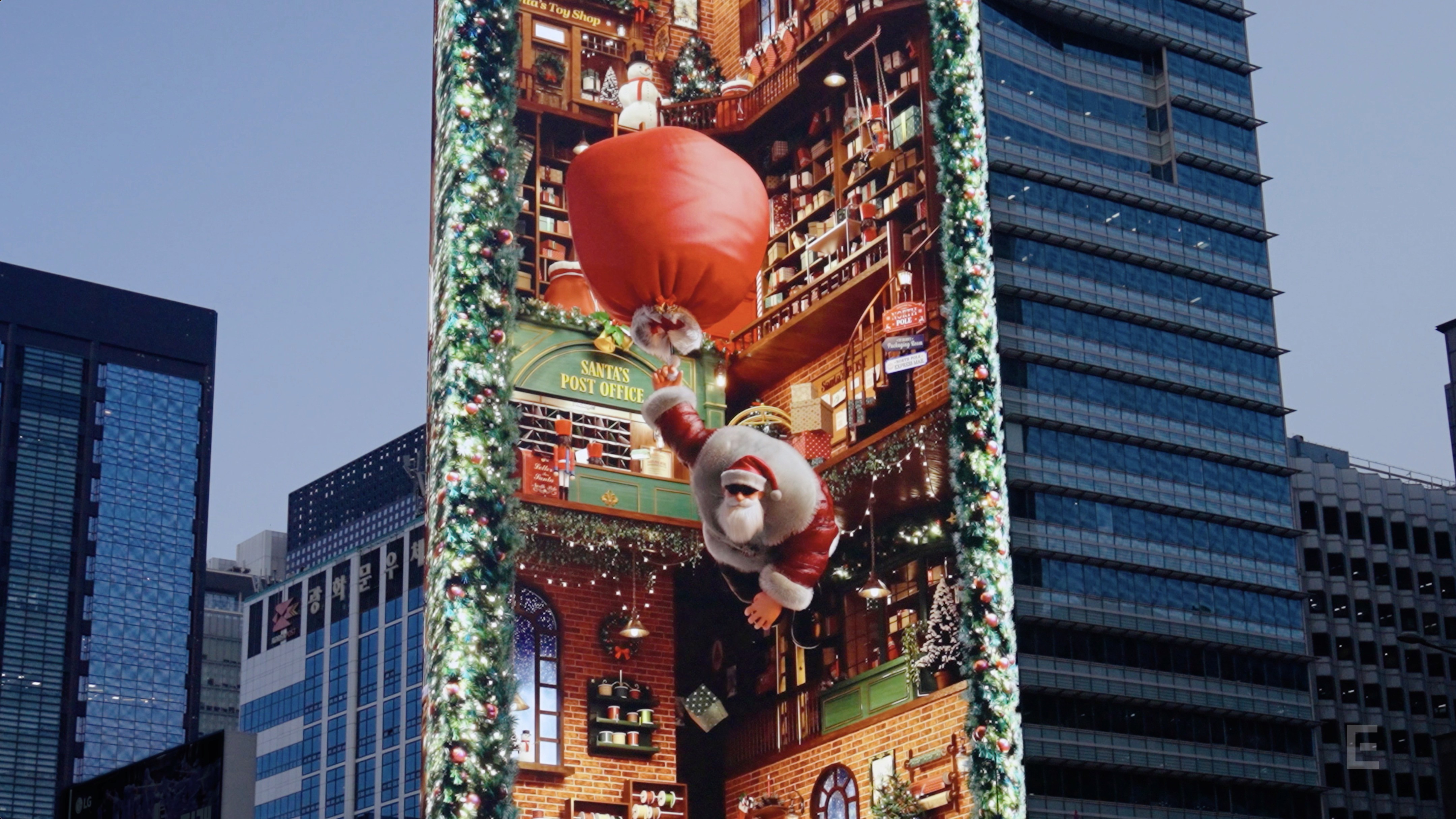 이지위드는 동아일보 광화문 사옥 옥외 미디어 사이니지 ‘룩스(LUUX)’에 크리스마스 시즌 콘텐츠 ‘산타의 마법 같은 출근길(SANTA’s MAGIC LIFT-OFF)’을 제작했습니다.