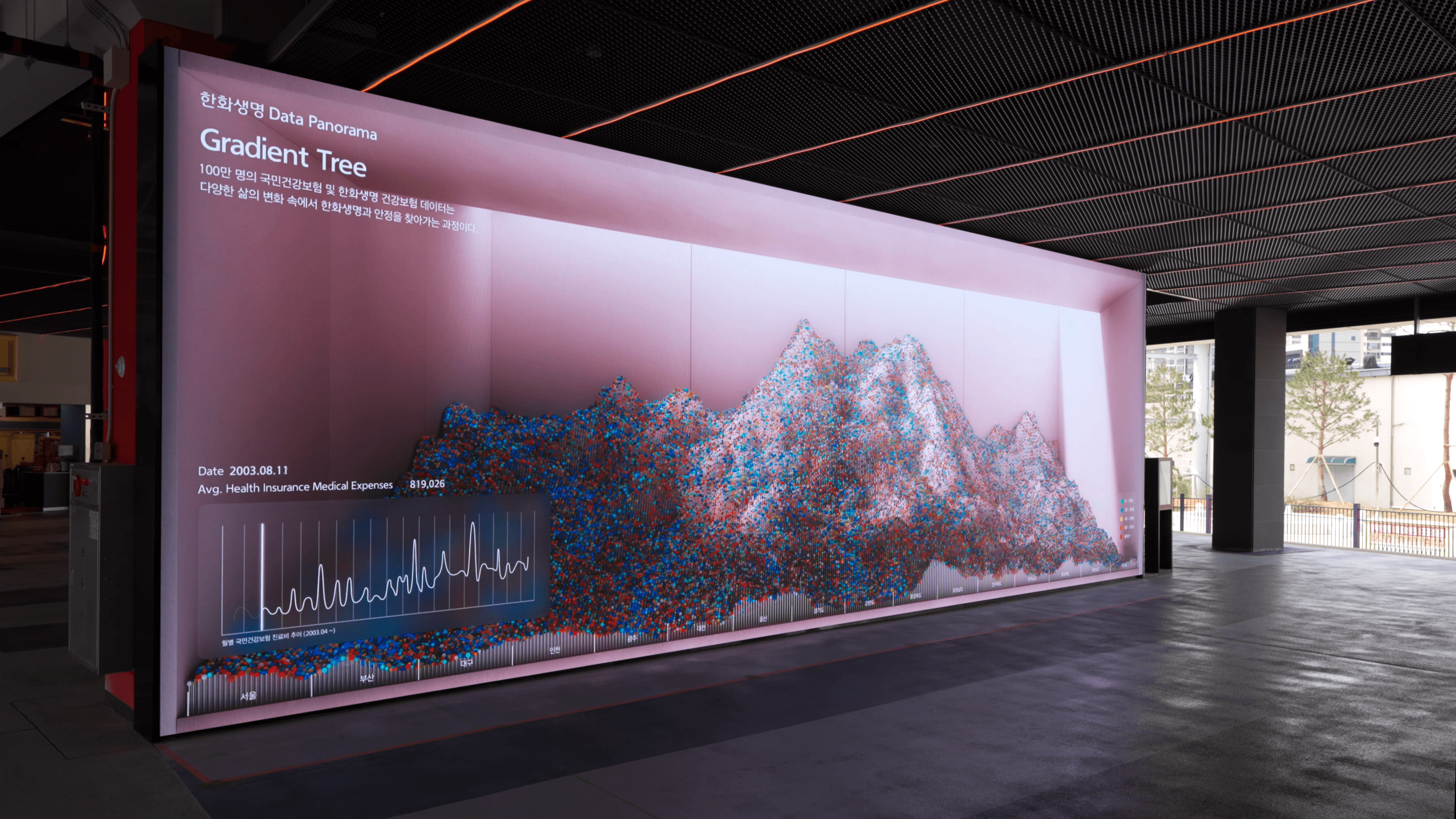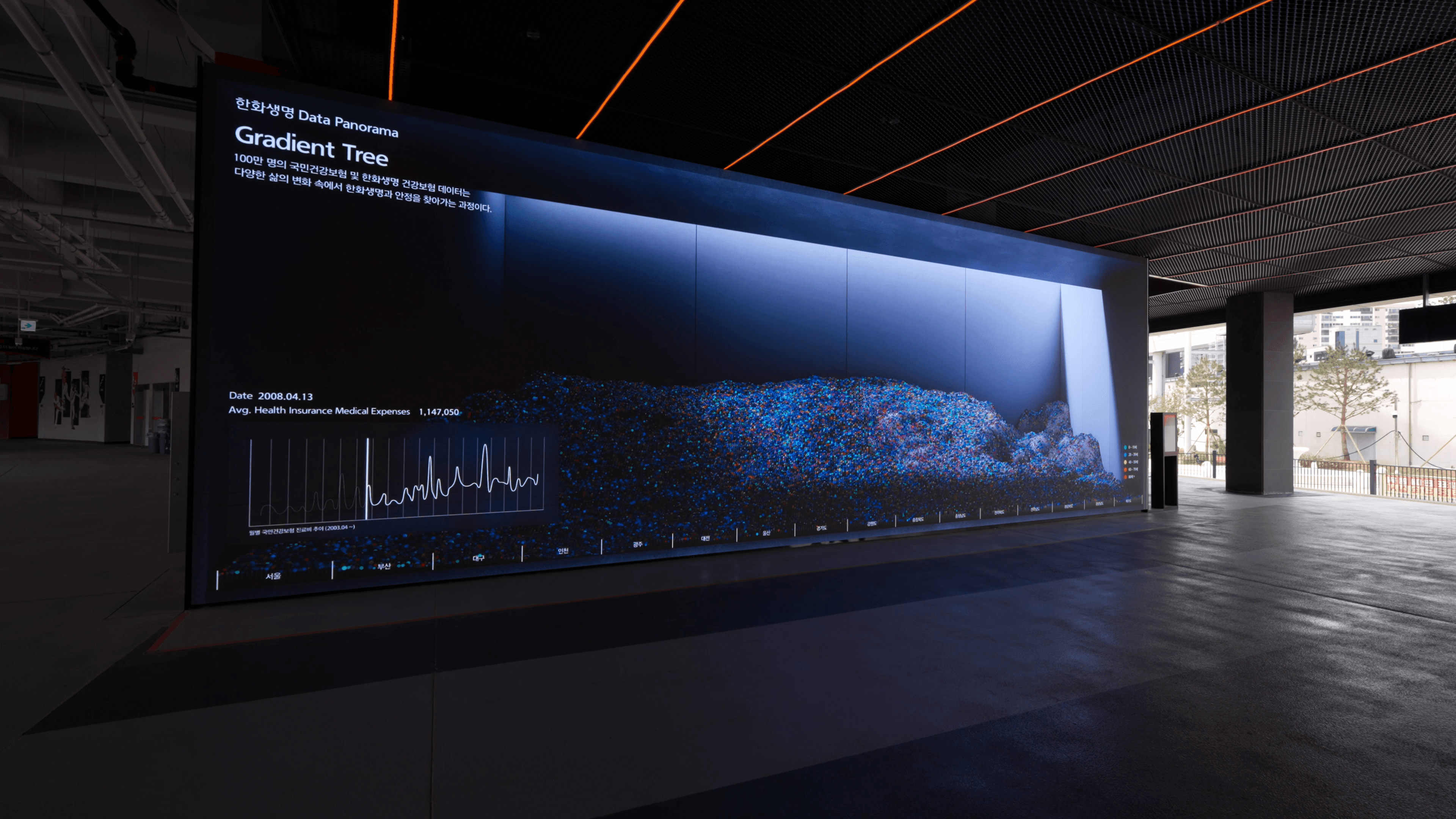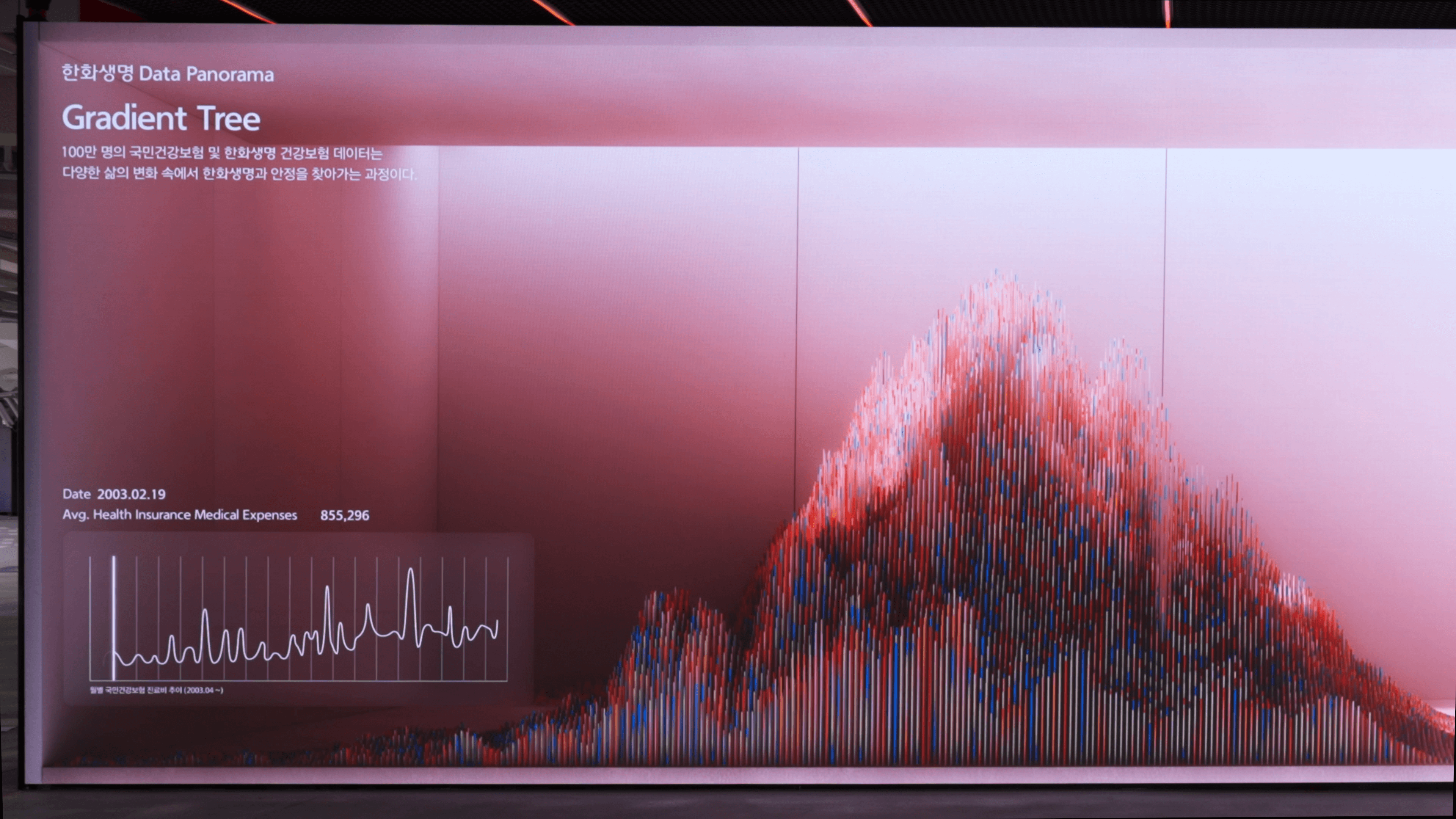 Easywith installed a large-scale LED wall measuring 12 meters wide and 4 meters high at the main hall of Hanwha Life Eagles Park in Daejeon, unveiling Data Panorama, a media art project that transforms approximately 30 million records of public and Hanwha Life data into art. Based on over three decades of accumulated information—including national health insurance records, insurance claim histories, pension and savings subscriptions, and data on the company’s contributions, volunteer work, and giving back to society—the project reinterprets this vast material into an artistic language, delivering an immersive visual experience.