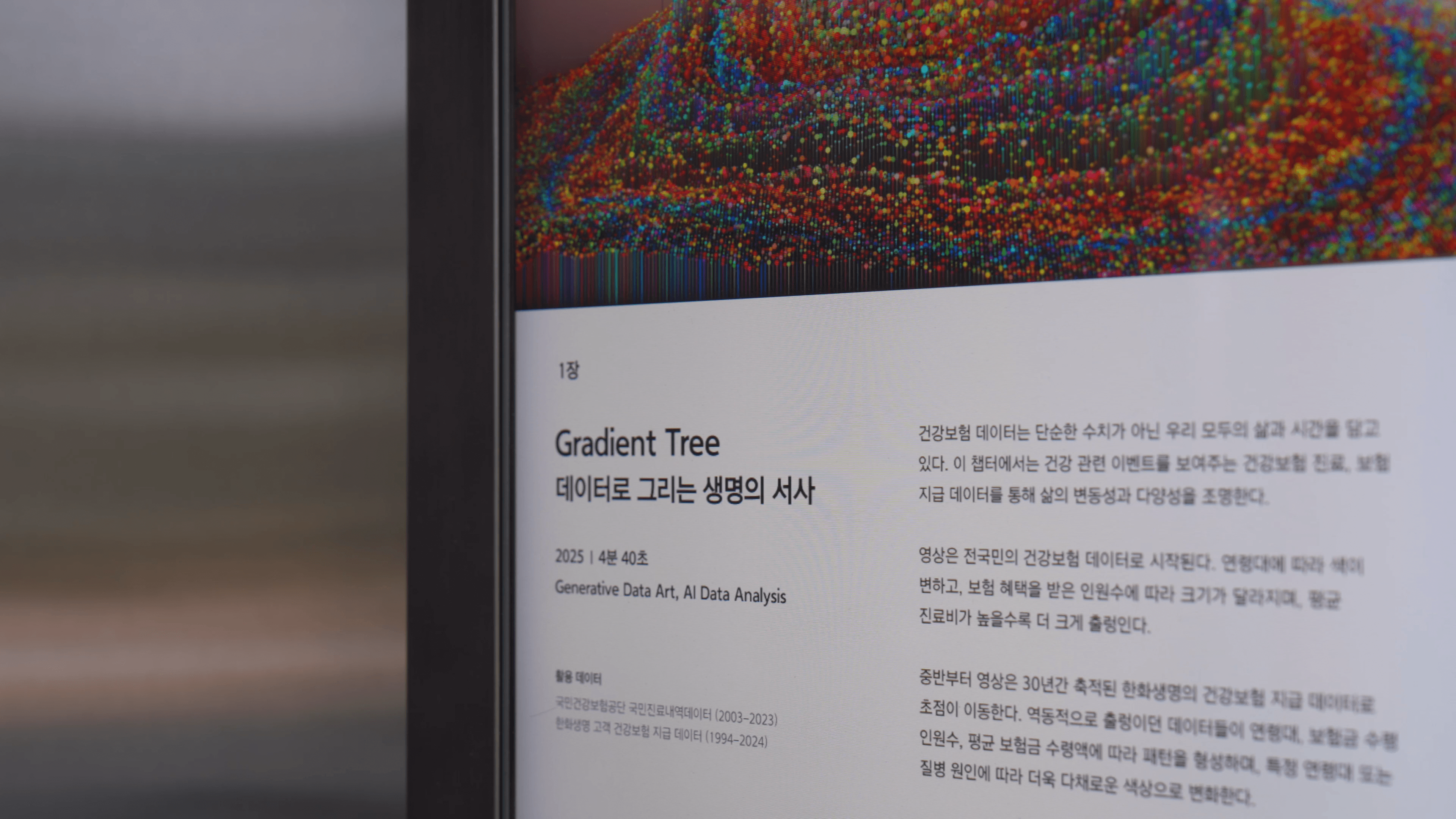 이지위드는 대전 한화생명 이글스파크 메인홀에 가로 12m, 세로 4m 규모의 대형 LED 월을 설치하고, 약 3,000만 건에 달하는 공공 및 한화생명 데이터를 예술로 구현한 미디어아트 프로젝트 ‘Data Panorama’를 선보였습니다. 국민건강보험 진료 기록, 보험금 지급 이력, 연금 및 저축 가입 정보, 사회공헌 활동 등 30여 년에 걸쳐 축적된 방대한 데이터를 기반으로, 이를 예술 언어로 재해석한 몰입형 콘텐츠입니다. 콘텐츠는 총 3개 챕터로 구성되며, 각 장에서는 데이터의 흐름이 대자연의 파노라마처럼 시각화됩니다. 건강 데이터를 생명의 나이테로 표현한 ‘Gradient Tree’, 금융 데이터의 흐름을 협곡 형태로 구현한 ‘Gradient Canyon’, 사회공헌 데이터를 불꽃 이미지로 시각화한 ‘Gradient Land’가 순차적으로 상영됩니다. 각 작품은 데이터의 요소, 크기, 변화량을 바탕으로 색채와 리듬, 공간감을 설계해 기술과 예술이 융합된 새로운 형태의 미디어아트 경험을 제공합니다.