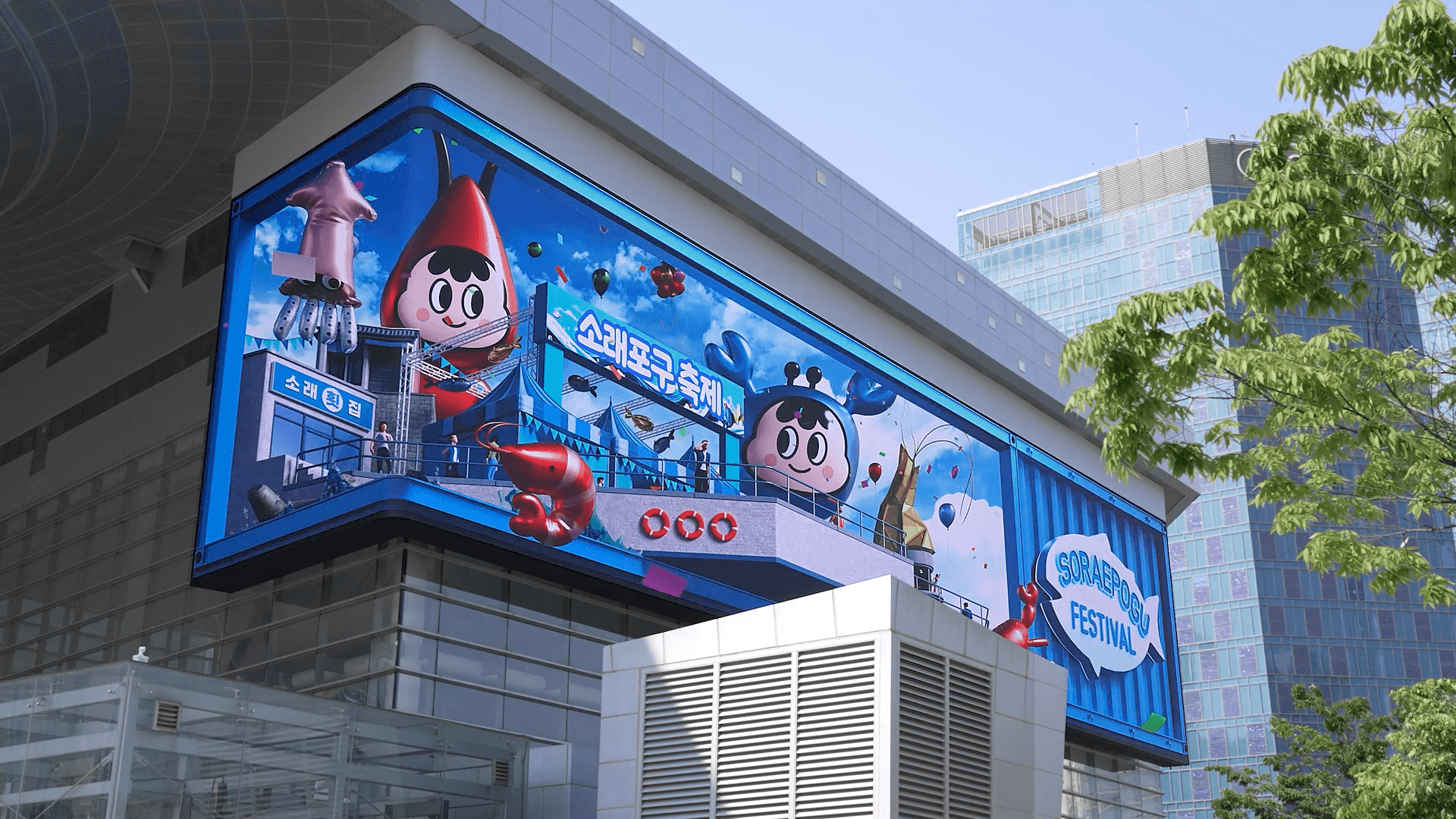 A main media screen measuring 528㎡ and a 16㎡ sub-screen were installed on the exterior walls, forming a powerful visual landmark in the heart of the city. A total of 40 types of content were produced, featuring IFEZ's vision, seasonal changes, local festivals, and real-time climate data; some of the visuals reinterpreted the cityscape through AI-generated art styles. Citizen-participatory content was designed to be accessed via QR codes on mobile devices, allowing people to engage in programs such as “Lucky Draw,” “Hidden Object Game,” and “Pet Decoration,” with results instantly displayed on the media wall. Through this project, Easywith successfully realized a smart city-style public media experience that seamlessly integrates technology, art, and citizen engagement, setting a new benchmark for digital urban communication.